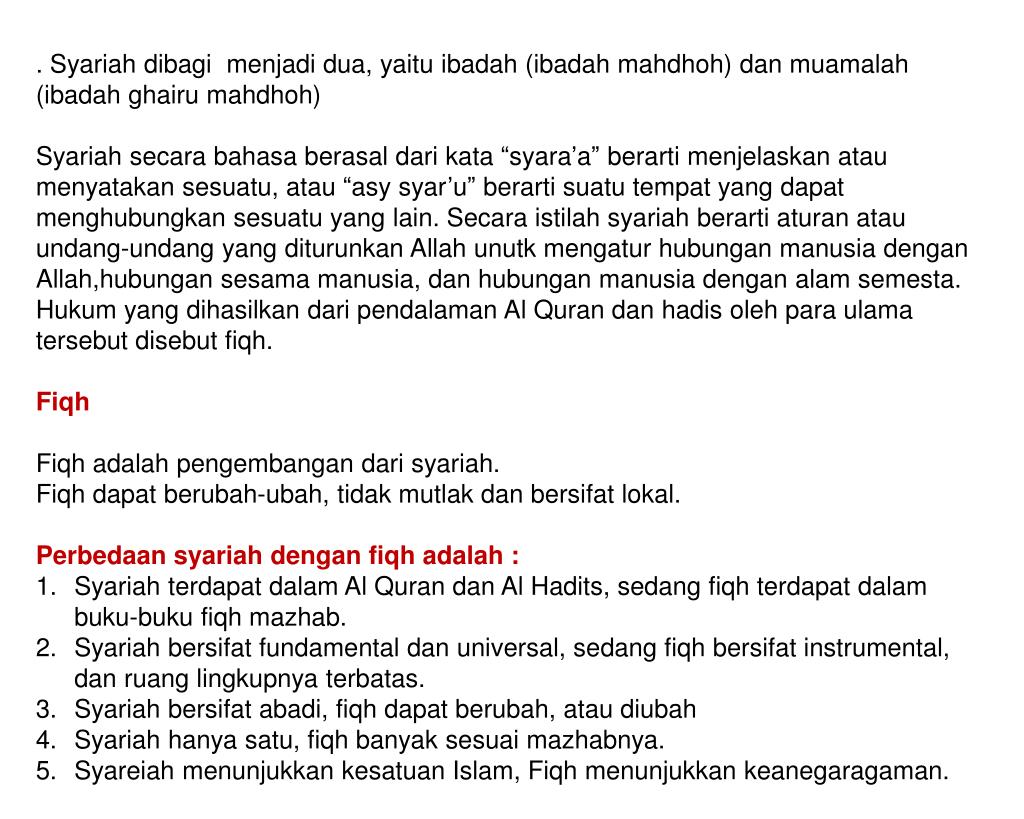 C. Karakteristik Syariah 1. Bersifat rabbaniyah dan diniyyah Mencerminkan kesucian syariah, dan rasa cinta dan penghargaan terhadapnya. 2. Menghormati dan mentaati hukummijtihad dan peraturan negara. 3. Membentuk akhlak dan moral Syariah memelihara hubungan masyarakat, menjaga nilai-nilai luhur masyarakat, dan manjujung tinggi nilai-nilai akhlak. 4. Bersifat realistis Syariah diturunkan Allah sesuai kejadian yang dialami manusia, menetapkan qishah bagi pembunuh secara sengaja, dan prinsip keadilan lainnya. Penerapan hukum secara bertahap dan berproses Misalnya mengenai haramnya hamr. D. Ruang Lingkup Syariah terdiri atas ibadah mahdhoh dan ibadah ghairu mahdhah. Ibadah mahdhah terdiri atas: Syahadat, shalat, zakat, puasa, dan haji. Ibadah ghairu mahdhah terdiri atas hubungan manusia dengan manusia lain, dengan dirinya sendiri dan dengan alam sekitar. Ibadah ghairu mahdhah seperti: perkawinan, perwalian, warisan, wasiat, hibah, tijarah, perburuhan, koperasi, sewa menyewa, pinjam meminjam, pemerintahan, hubungan antar bangsa, dan hubungan antar golongan.