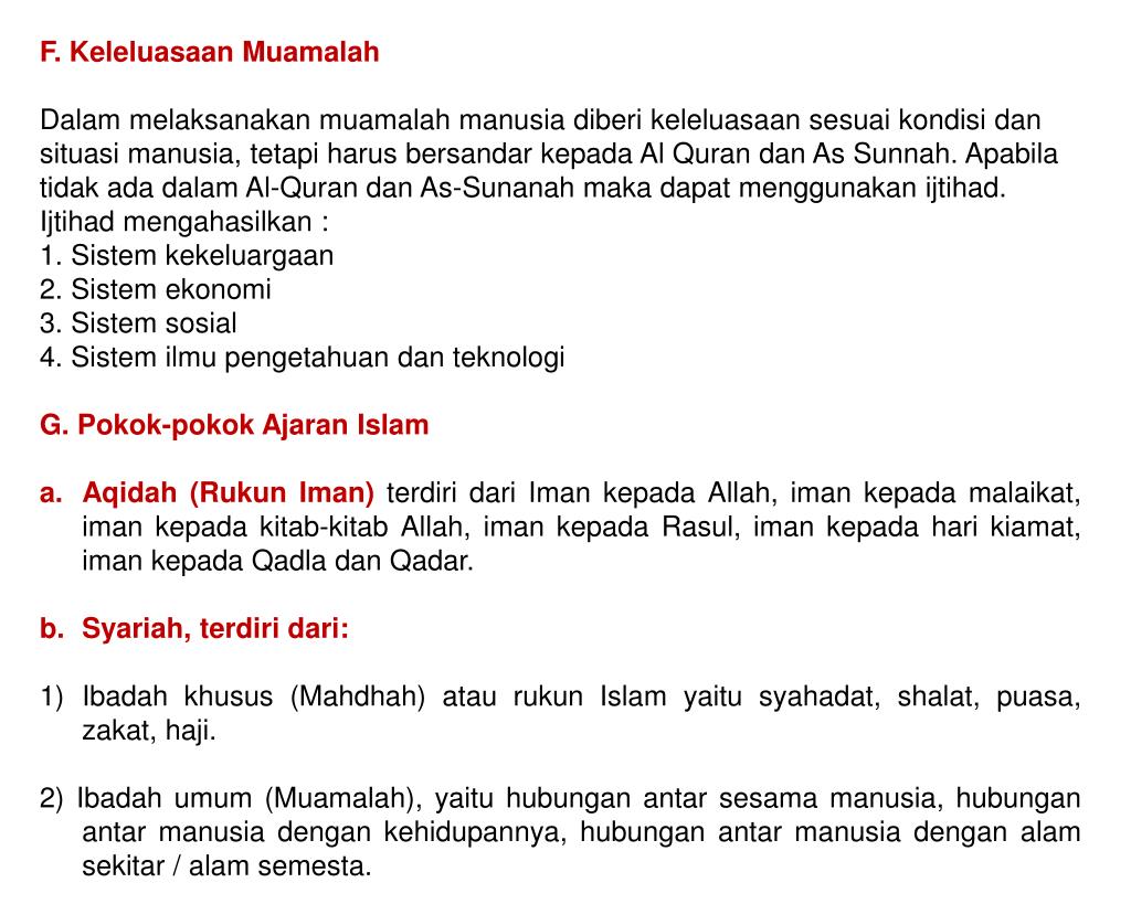 F. KeleluasaanMuamalah Dalammelaksanakanmuamalahmanusiadiberikeleluasaansesuaikondisidansituasimanusia, tetapiharusbersandarkepada Al Qurandan As Sunnah. Apabilatidakadadalam Al-Qurandan As-Sunanahmakadapatmenggunakanijtihad. Ijtihadmengahasilkan : 1. Sistemkekeluargaan 2. Sistemekonomi 3. Sistemsosial 4. Sistemilmupengetahuandanteknologi G. Pokok-pokokAjaran Islam a. Aqidah (RukunIman) terdiridariImankepada Allah, imankepadamalaikat, imankepadakitab-kitab Allah, imankepadaRasul, imankepadaharikiamat, imankepadaQadladanQadar. b. Syariah, terdiridari: 1) Ibadahkhusus (Mahdhah) ataurukun Islam yaitusyahadat, shalat, puasa, zakat, haji. 2) Ibadahumum (Muamalah), yaituhubunganantarsesamamanusia, hubunganantarmanusiadengankehidupannya, hubunganantarmanusiadenganalamsekitar / alamsemesta.