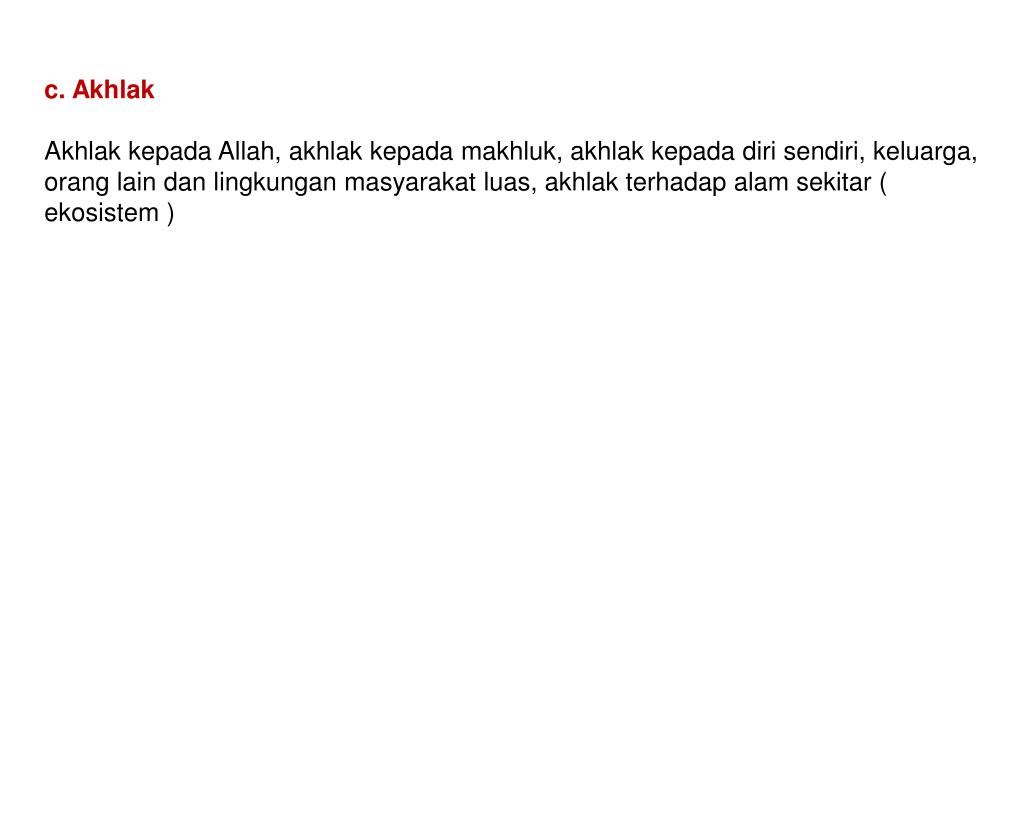 c. Akhlak Akhlak kepada Allah, akhlak kepada makhluk, akhlak kepada diri sendiri, keluarga, orang lain dan lingkungan masyarakat luas, akhlak terhadap alam sekitar ( ekosistem )
