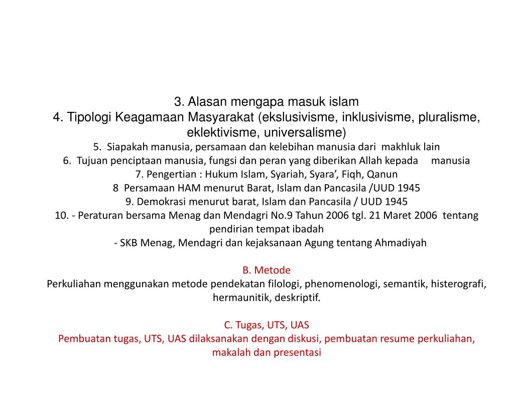 3. Alasanmengapamasukislam4. TipologiKeagamaanMasyarakat (ekslusivisme, inklusivisme, pluralisme, eklektivisme, universalisme)5. Siapakahmanusia, persamaandankelebihanmanusiadarimakhluk lain6. Tujuanpenciptaanmanusia, fungsidanperan yang diberikan Allah kepadamanusia7. Pengertian : Hukum Islam, Syariah, Syara’, Fiqh, Qanun8 Persamaan HAM menurutBarat, Islam danPancasila /UUD 19459. Demokrasimenurutbarat, Islam danPancasila / UUD 194510. - PeraturanbersamaMenagdanMendagri No.9 Tahun 2006 tgl. 21 Maret 2006 tentangpendiriantempatibadah - SKB Menag, MendagridankejaksanaanAgungtentangAhmadiyahB. MetodePerkuliahanmenggunakanmetodependekatanfilologi, phenomenologi, semantik, histerografi, hermaunitik, deskriptif. C. Tugas, UTS, UASPembuatantugas, UTS, UAS dilaksanakandengandiskusi, pembuatan resume perkuliahan, makalahdanpresentasi