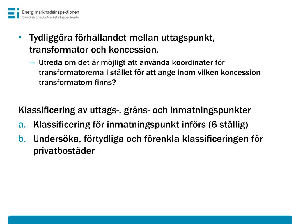 Tydliggöra förhållandet mellan uttagspunkt, transformator och koncession. • Utreda om det är möjligt att använda koordinater för transformatorerna i stället för att ange inom vilken koncession transformatorn finns? Klassificering av uttags-, gräns- och inmatningspunkter • Klassificering för inmatningspunkt införs (6 ställig) • Undersöka, förtydliga och förenkla klassificeringen för privatbostäder