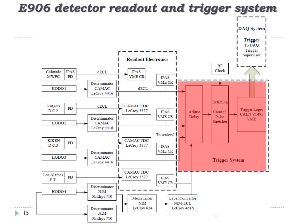 Data flow The proton beam structure is 5 sec spill of 1*1013 protons each minute 53MHz Four stations fast response hodoscope • Hardware trigger • CommercialFPGA board CAEN V1495 • Decision synchronous with RF clock LV1 All the data from each detectors are caught by this TDC/latch card which was designed by IPAS Chamber TDC /Latch by IPAS ~1KHz
