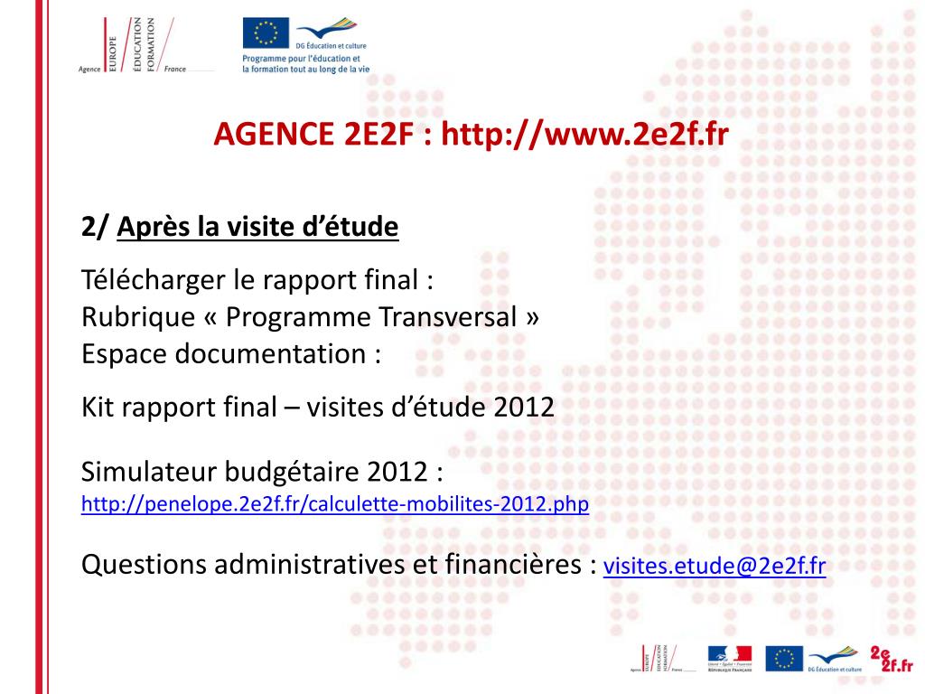 AGENCE 2E2F : http://www.2e2f.fr 2/ Après la visite d’étude Télécharger le rapport final : Rubrique « Programme Transversal » Espace documentation : • Kit rapport final – visites d’étude 2012 • Simulateur budgétaire 2012 : • http://penelope.2e2f.fr/calculette-mobilites-2012.php • Questions administratives et financières : visites.etude@2e2f.fr