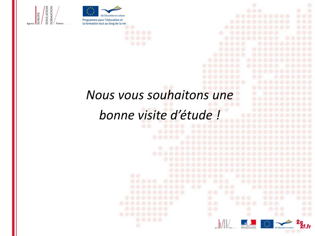 Rappel sur l’action « Visite d’étude » • Cette action s’adresse à tous les spécialistes et décideurs de l’éducation et de la formation professionnelle au niveau local, régional ou national. • Votre fonction • ● Responsables de la formation professionnelle, en particulier les partenaires sociaux • ●Responsables de l’éducation, y compris l’éducation des adultes et l’enseignement supérieur • Objectifs • ●Avoir une meilleure connaissance de la situation dans les pays européens sur le thème de la visite; • ●Échanger des avis et des conseils entre pairs, repérer les similitudes et les différences, enrichir les réseaux. • Comment • ●rencontre avec des experts du pays hôte, observations • ●analyse, échange de points de vue, rapport collectif.