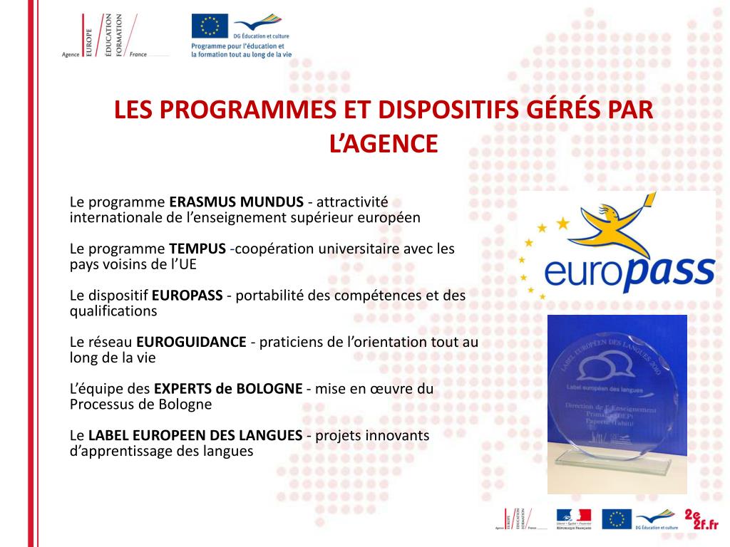 LES PROGRAMMES ET DISPOSITIFS GÉRÉS PAR L’AGENCE Le programme ERASMUS MUNDUS - attractivité internationale de l’enseignement supérieur européen Le programme TEMPUS-coopération universitaire avec les pays voisins de l’UE Le dispositif EUROPASS - portabilité des compétences et des qualifications Le réseau EUROGUIDANCE - praticiens de l’orientation tout au long de la vie L’équipe des EXPERTS de BOLOGNE - mise en œuvre du Processus de Bologne Le LABEL EUROPEEN DES LANGUES - projets innovants d’apprentissage des langues