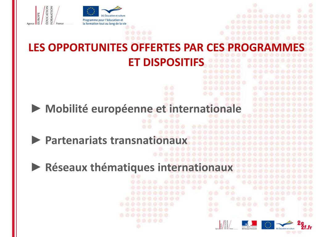 LES OPPORTUNITES OFFERTES PAR CES PROGRAMMES ET DISPOSITIFS ► Mobilité européenne et internationale ► Partenariats transnationaux ► Réseaux thématiques internationaux