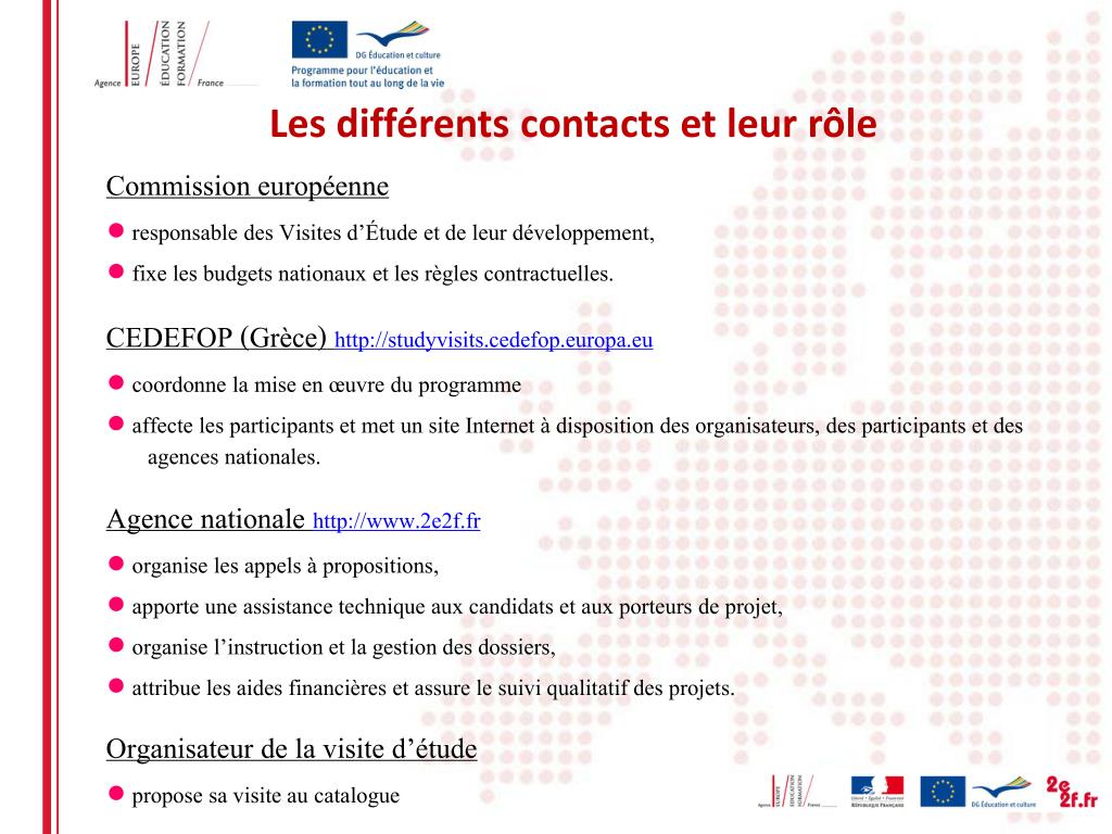 Les différents contacts et leur rôle • Commission européenne • ● responsable des Visites d’Étude et de leur développement, • ● fixe les budgets nationaux et les règles contractuelles. • CEDEFOP (Grèce) http://studyvisits.cedefop.europa.eu • ● coordonne la mise en œuvre du programme • ●affecte les participants et met un site Internet à disposition des organisateurs, des participants et des agences nationales. • Agence nationale http://www.2e2f.fr • ● organise les appels à propositions, • ● apporte une assistance technique aux candidats et aux porteurs de projet, • ● organise l’instruction et la gestion des dossiers, • ● attribue les aides financières et assure le suivi qualitatif des projets. • Organisateur de la visite d’étude • ● propose sa visite au catalogue