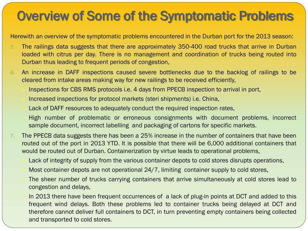 Overview of Some of the Symptomatic Problems Herewith an overview of the symptomatic problems encountered in the Durban port for the 2013 season: • The railings data suggests that there are approximately 350-400 road trucks that arrive in Durban loaded with citrus per day. There is no management and coordination of trucks being routed into Durban thus leading to frequent periods of congestion, • An increase in DAFF inspections caused severe bottlenecks due to the backlog of railings to be cleared from intake areas making way for new railings to be received efficiently, • Inspections for CBS RMS protocols i.e. 4 days from PPECB inspection to arrival in port, • Increased inspections for protocol markets (steri shipments) i.e. China, • Lack of DAFF resources to adequately conduct the required inspection rates, • High number of problematic or erroneous consignments with document problems, incorrect sample document, incorrect labelling and packaging of cartons for specific markets. • The PPECB data suggests there has been a 25% increase in the number of containers that have been routed out of the port in 2013 YTD. It is possible that there will be 6,000 additional containers that would be routed out of Durban. Containerization by virtue leads to operational problems, • Lack of integrity of supply from the various container depots to cold stores disrupts operations, • Most container depots are not operational 24/7, limiting container supply to cold stores, • The sheer number of trucks carrying containers that arrive simultaneously at cold stores lead to congestion and delays, • In 2013 there have been frequent occurrences of a lack of plug-in points at DCT and added to this frequent wind delays. Both these problems led to container trucks being delayed at DCT and therefore cannot deliver full containers to DCT, in turn preventing empty containers being collected and transported to cold stores.