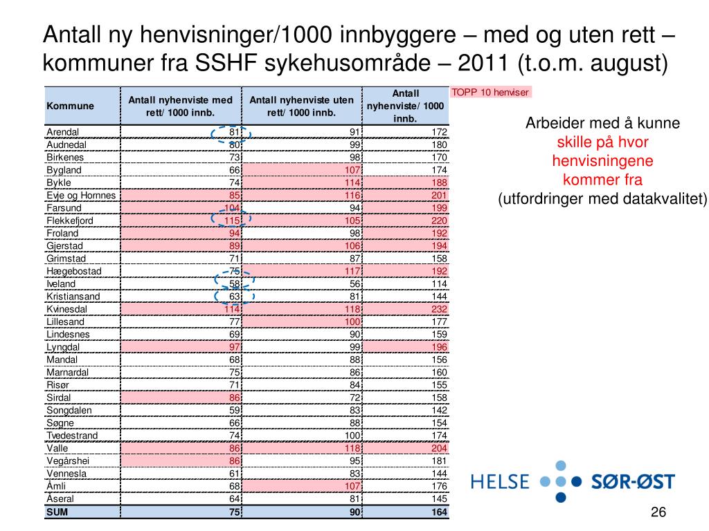 Antall ny henvisninger/1000 innbyggere – med og uten rett – kommuner fra SSHF sykehusområde – 2011 (t.o.m. august) Arbeider med å kunne skille på hvor henvisningene kommer fra (utfordringer med datakvalitet)