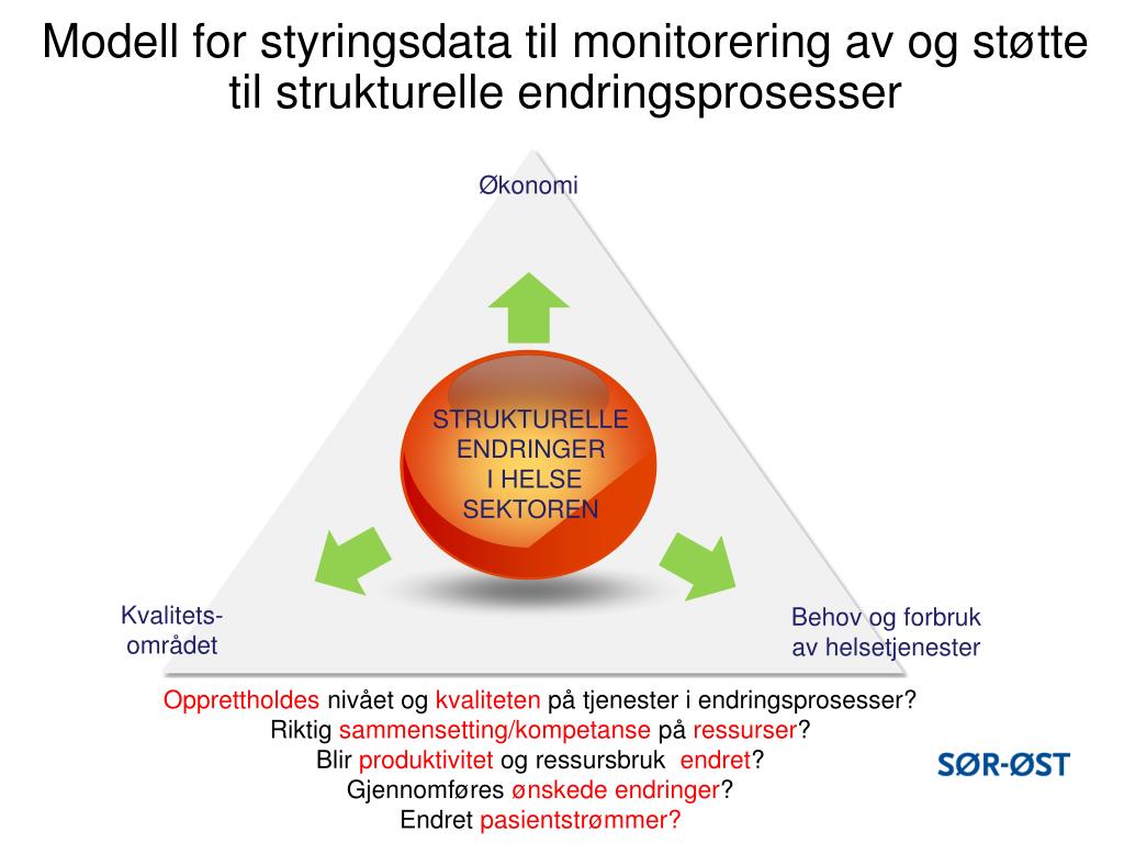Modell for styringsdata til monitorering av og støtte til strukturelle endringsprosesser Økonomi STRUKTURELLE ENDRINGER I HELSE SEKTOREN Kvalitets- området Behov og forbruk av helsetjenester Opprettholdes nivået og kvaliteten på tjenester i endringsprosesser? Riktig sammensetting/kompetanse på ressurser? Blir produktivitet og ressursbruk endret? Gjennomføres ønskede endringer? Endret pasientstrømmer?