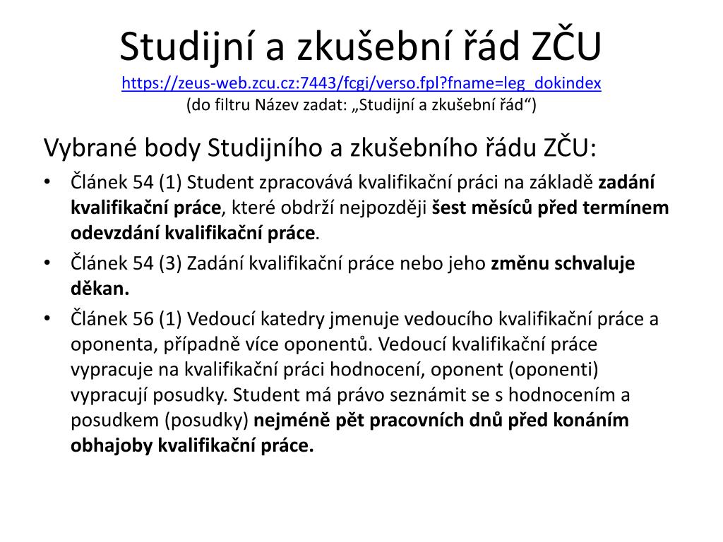 Studijní a zkušební řád ZČUhttps://zeus-web.zcu.cz:7443/fcgi/verso.fpl?fname=leg_dokindex(do filtru Název zadat: „Studijní a zkušební řád“) Vybrané body Studijního a zkušebního řádu ZČU: • Článek 54 (1) Student zpracovává kvalifikační práci na základě zadání kvalifikační práce, které obdrží nejpozději šest měsíců před termínem odevzdání kvalifikační práce. • Článek 54 (3) Zadání kvalifikační práce nebo jeho změnu schvaluje děkan. • Článek 56 (1) Vedoucí katedry jmenuje vedoucího kvalifikační práce a oponenta, případně více oponentů. Vedoucí kvalifikační práce vypracuje na kvalifikační práci hodnocení, oponent (oponenti) vypracují posudky. Student má právo seznámit se s hodnocením a posudkem (posudky) nejméně pět pracovních dnů před konáním obhajoby kvalifikační práce.