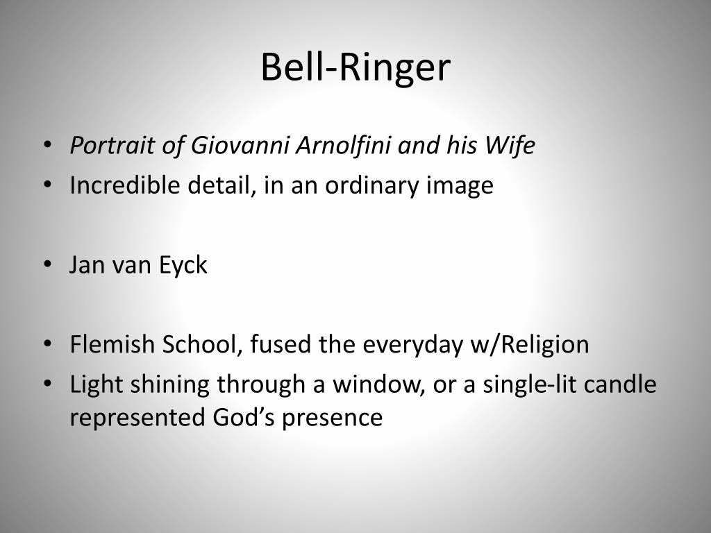 Bell-Ringer • Portrait of Giovanni Arnolfini and his Wife • Incredible detail, in an ordinary image • Jan van Eyck • Flemish School, fused the everyday w/Religion • Light shining through a window, or a single-lit candle represented God’s presence