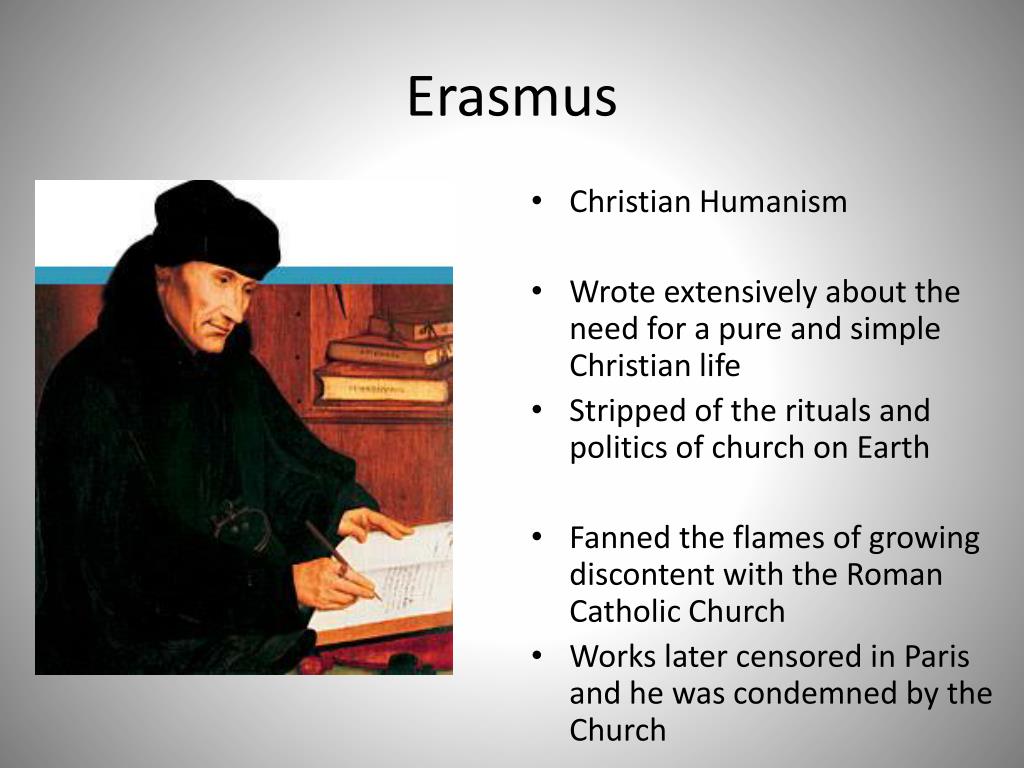Erasmus • Christian Humanism • Wrote extensively about the need for a pure and simple Christian life • Stripped of the rituals and politics of church on Earth • Fanned the flames of growing discontent with the Roman Catholic Church • Works later censored in Paris and he was condemned by the Church