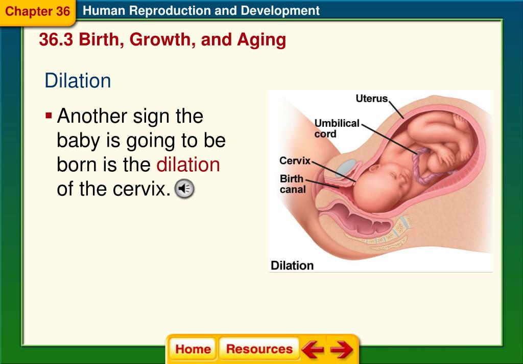 Human Reproduction and Development Chapter 36 36.3 Birth, Growth, and Aging Dilation • Another sign the baby is going to be born is the dilation of the cervix.