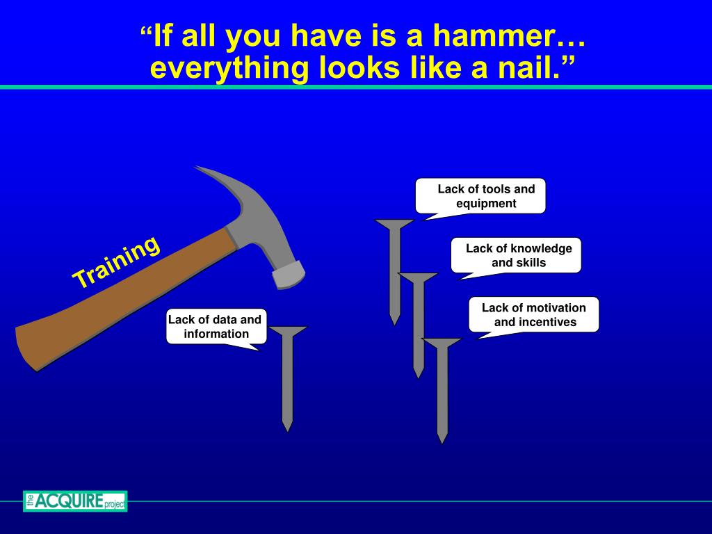“If all you have is a hammer… everything looks like a nail.” Lack of tools and equipment Lack of knowledge and skills Training Lack of motivation and incentives Lack of data and information