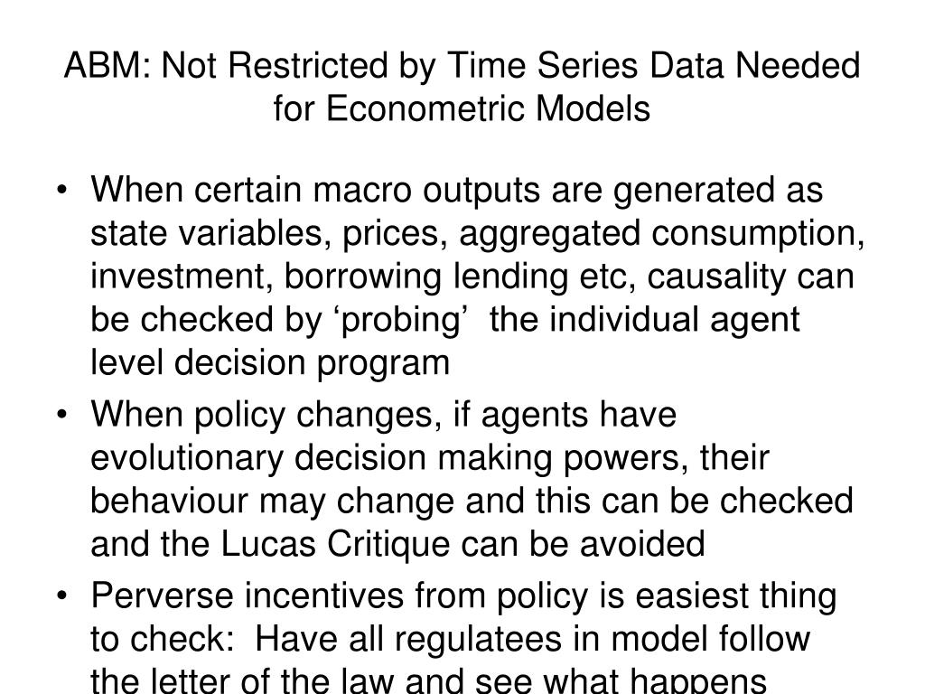 ABM: Not Restricted by Time Series Data Needed for Econometric Models • When certain macro outputs are generated as state variables, prices, aggregated consumption, investment, borrowing lending etc, causality can be checked by ‘probing’ the individual agent level decision program • When policy changes, if agents have evolutionary decision making powers, their behaviour may change and this can be checked and the Lucas Critique can be avoided • Perverse incentives from policy is easiest thing to check: Have all regulatees in model follow the letter of the law and see what happens • In MAFNs agents are nodes in a network