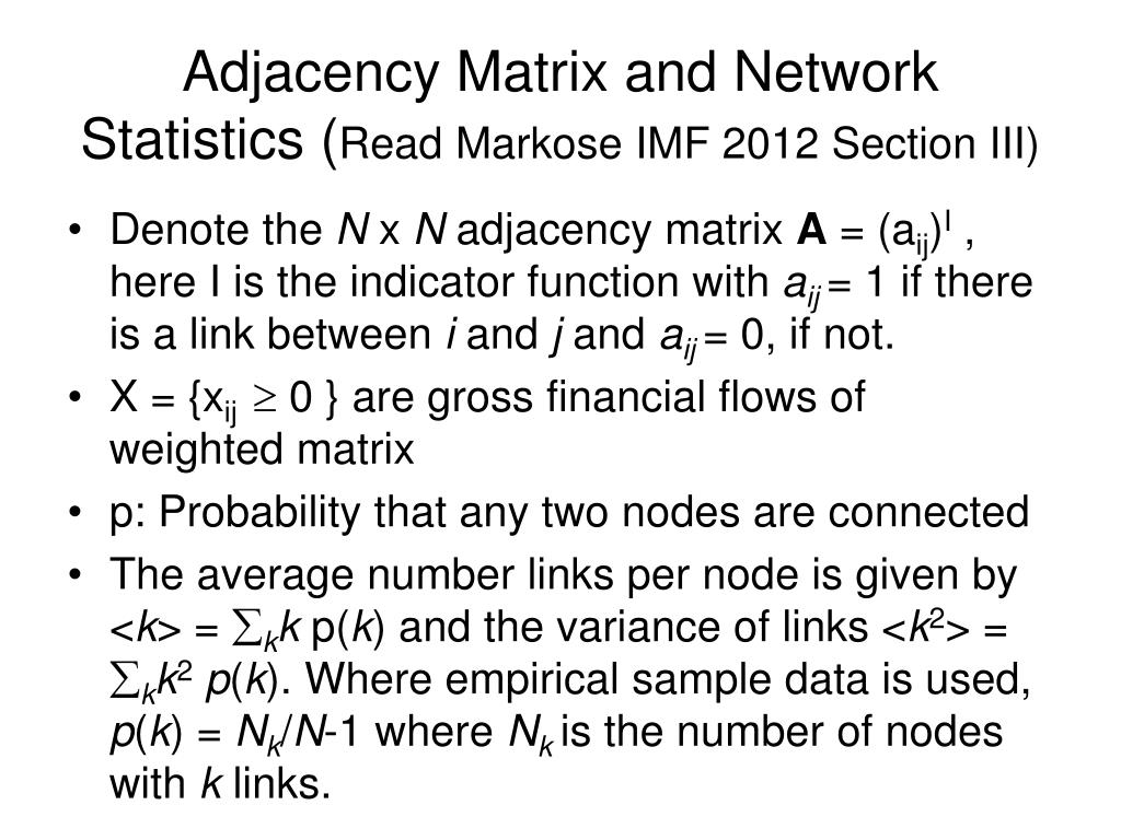 Adjacency Matrix and Network Statistics (Read Markose IMF 2012 Section III) • Denote the N x N adjacency matrix A=(aij)I , here I is the indicator function with aij= 1 if there is a link between i and j and aij= 0, if not. • X = {xij 0 } are gross financial flows of weighted matrix • p: Probability that any two nodes are connected • The average number links per node is given by <k> = kk p(k) and the variance of links <k2> = kk2p(k). Where empirical sample data is used, p(k) = Nk/N-1 where Nkis the number of nodes with k links.