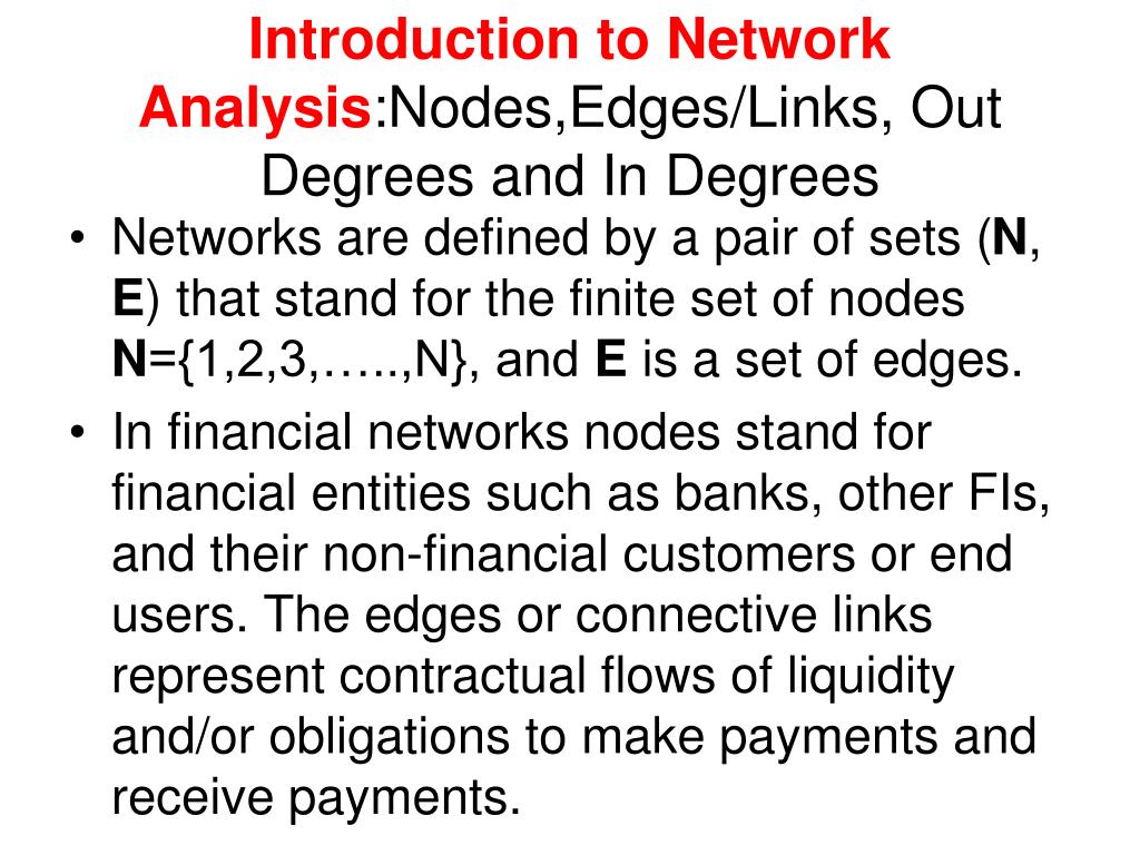 Introduction to Network Analysis:Nodes,Edges/Links, Out Degrees and In Degrees • Networks are defined by a pair of sets (N, E) that stand for the finite set of nodes N={1,2,3,…..,N}, and E is a set of edges. • In financial networks nodes stand for financial entities such as banks, other FIs, and their non-financial customers or end users. The edges or connective links represent contractual flows of liquidity and/or obligations to make payments and receive payments.