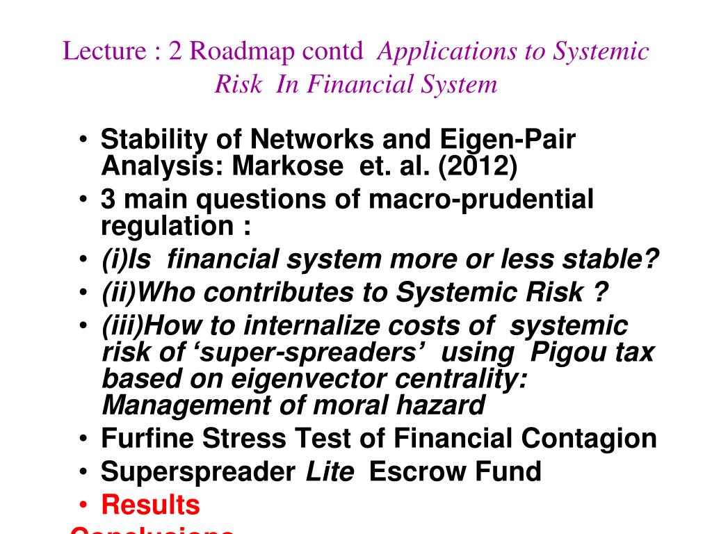 Lecture : 2 Roadmap contdApplications to Systemic Risk In Financial System • Stability of Networks and Eigen-Pair Analysis: Markose et. al. (2012) • 3 main questions of macro-prudential regulation : • (i)Is financial system more or less stable? • (ii)Who contributes to Systemic Risk ? • (iii)How to internalize costs of systemic risk of ‘super-spreaders’ using Pigou tax based on eigenvector centrality: Management of moral hazard • Furfine Stress Test of Financial Contagion • SuperspreaderLite Escrow Fund • Results • Conclusions