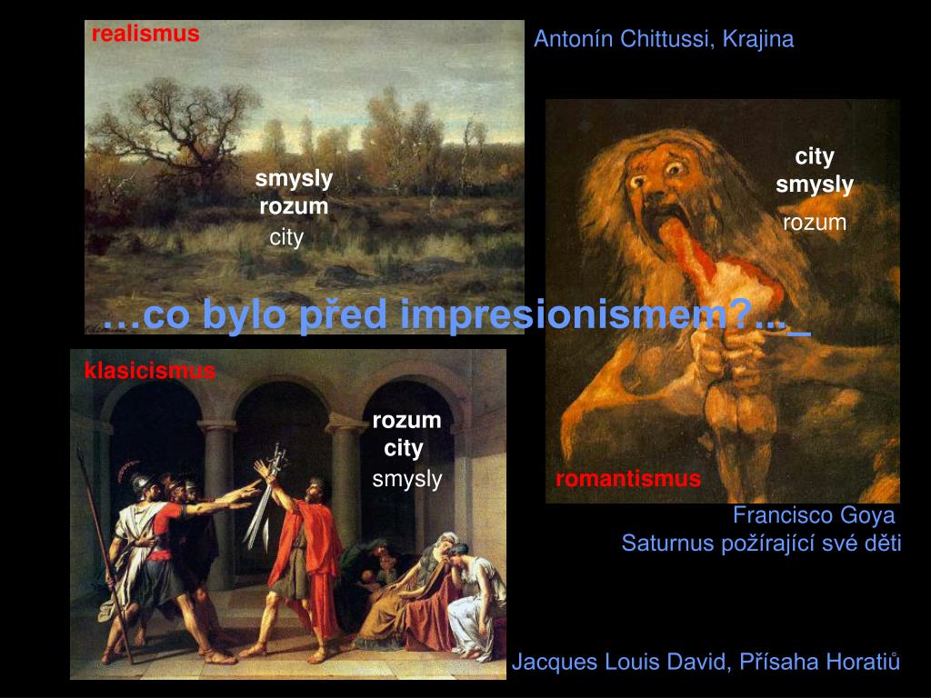 realismus Antonín Chittussi, Krajina city smysly smysly rozum rozum city …co bylo před impresionismem?..._ klasicismus rozum city smysly romantismus Francisco Goya Saturnus požírající své děti Jacques Louis David, Přísaha Horatiů