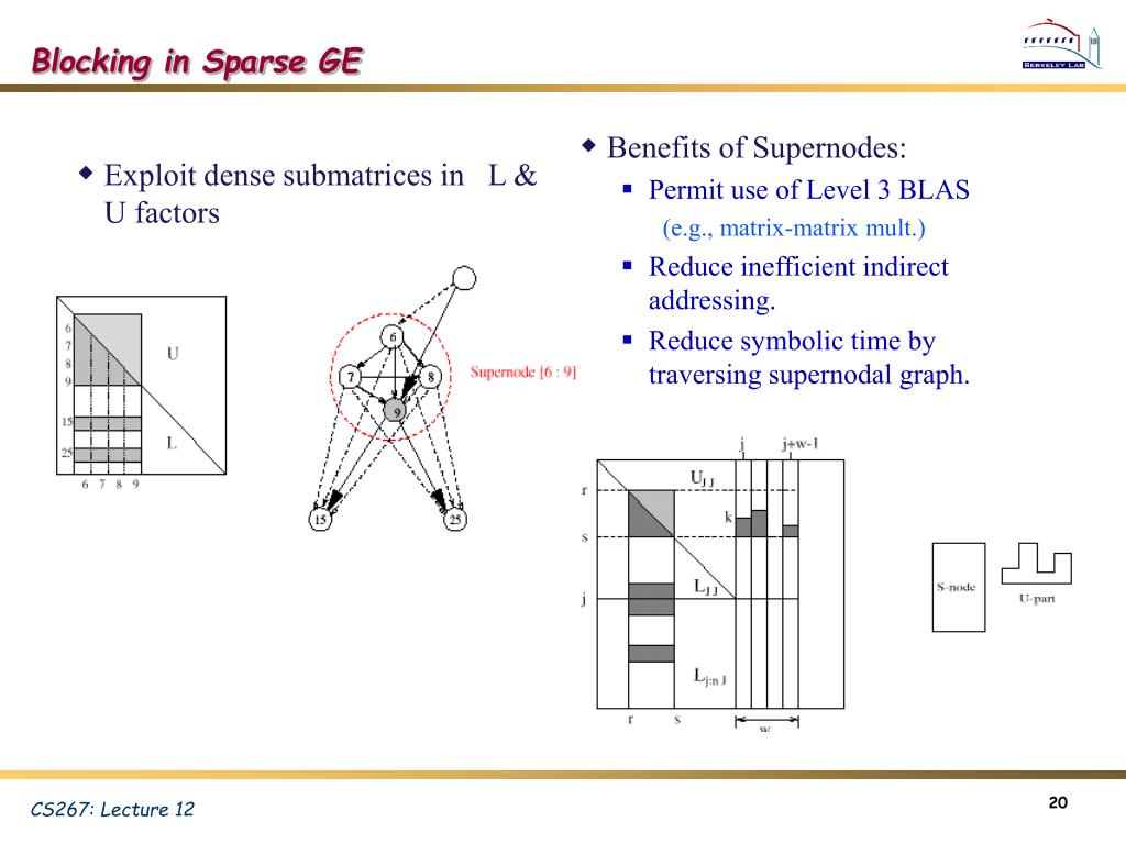 Benefits of Supernodes: Permit use of Level 3 BLAS (e.g., matrix-matrix mult.) Reduce inefficient indirect addressing. Reduce symbolic time by traversing supernodal graph. Exploit dense submatrices in L & U factors Blocking in Sparse GE