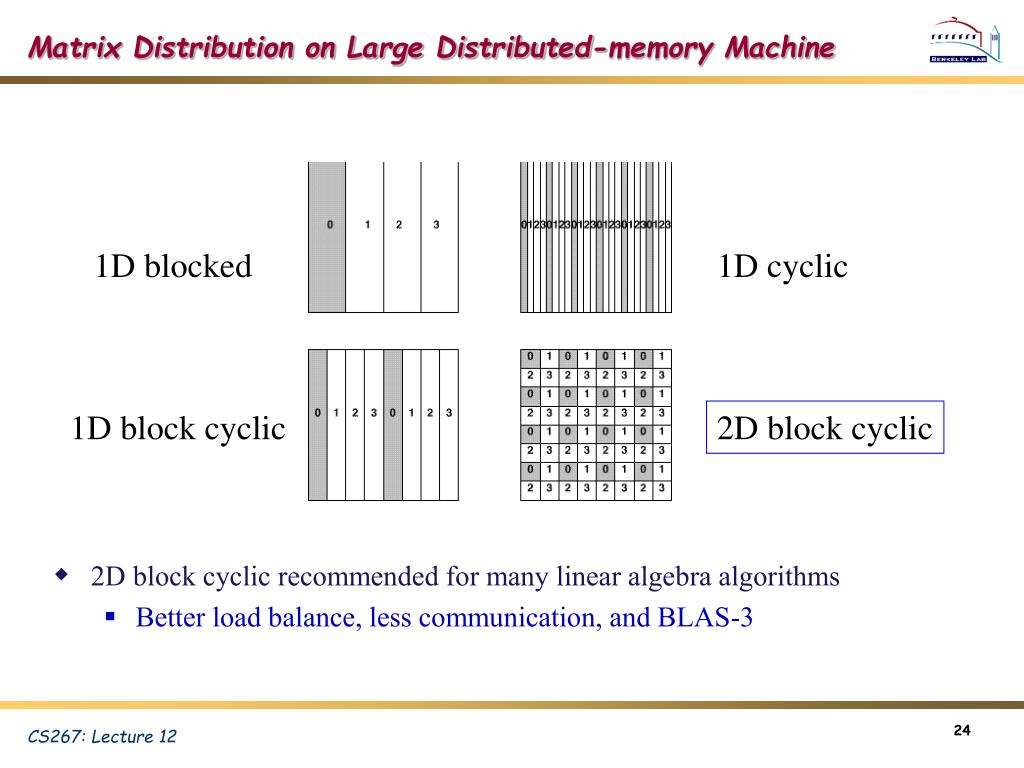 Matrix Distribution on Large Distributed-memory Machine • 2D block cyclic recommended for many linear algebra algorithms • Better load balance, less communication, and BLAS-3 1D blocked 1D cyclic 1D block cyclic 2D block cyclic