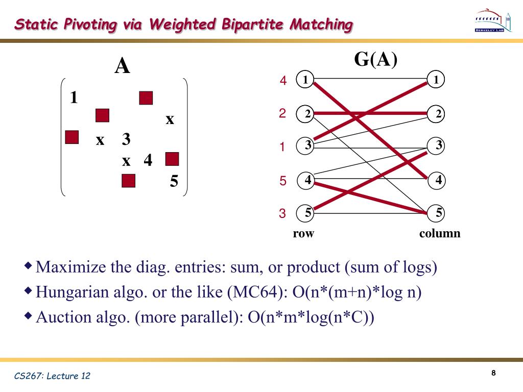 Numerical Pivoting • Goal of pivoting is to control element growth in L & U for stability • For sparse factorizations, often relax the pivoting rule to trade with better sparsity and parallelism (e.g., threshold pivoting, static pivoting , . . .) • Partial pivoting used in sequential SuperLU (GEPP) • Can force diagonal pivoting (controlled by diagonal threshold) • Hard to implement scalably for sparse factorization • Static pivoting used in SuperLU_DIST (GESP) • Before factor, scale and permute A to maximize diagonal: Pr Dr A Dc = A’ • Pr is found by a weighted bipartite matching algorithm on G(A) • During factor A’ = LU, replace tiny pivots by , without changing data structures for L & U • If needed, use a few steps of iterative refinement to improve the first solution • Quite stable in practice x s x b x x x