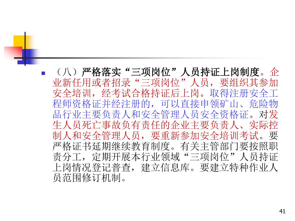 (八)严格落实“三项岗位”人员持证上岗制度。企业新任用或者招录“三项岗位”人员,要组织其参加安全培训,经考试合格持证后上岗。取得注册安全工程师资格证并经注册的,可以直接申领矿山、危险物品行业主要负责人和安全管理人员安全资格证。对发生人员死亡事故负有责任的企业主要负责人、实际控制人和安全管理人员,要重新参加安全培训考试。要严格证书延期继续教育制度。有关主管部门要按照职责分工,定期开展本行业领域“三项岗位”人员持证上岗情况登记普查,建立信息库。要建立特种作业人员范围修订机制。(八)严格落实“三项岗位”人员持证上岗制度。企业新任用或者招录“三项岗位”人员,要组织其参加安全培训,经考试合格持证后上岗。取得注册安全工程师资格证并经注册的,可以直接申领矿山、危险物品行业主要负责人和安全管理人员安全资格证。对发生人员死亡事故负有责任的企业主要负责人、实际控制人和安全管理人员,要重新参加安全培训考试。要严格证书延期继续教育制度。有关主管部门要按照职责分工,定期开展本行业领域“三项岗位”人员持证上岗情况登记普查,建立信息库。要建立特种作业人员范围修订机制。