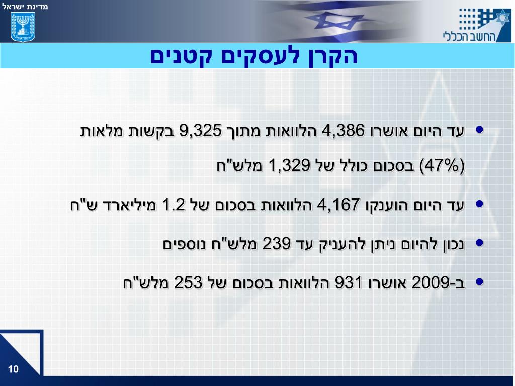 הקרן לעסקים קטנים • עד היום אושרו 4,386 הלוואות מתוך 9,325 בקשות מלאות (47%) בסכום כולל של 1,329 מלש"ח • עד היום הוענקו 4,167 הלוואות בסכום של 1.2 מיליארד ש"ח • נכון להיום ניתן להעניק עד 239 מלש"ח נוספים • ב-2009 אושרו 931 הלוואות בסכום של 253 מלש"ח