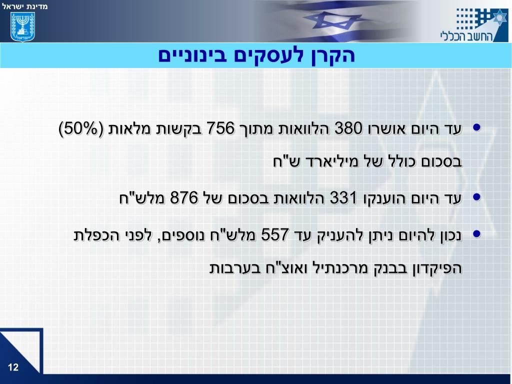 הקרן לעסקים בינוניים • עד היום אושרו 380 הלוואות מתוך 756 בקשות מלאות (50%) בסכום כולל של מיליארד ש"ח • עד היום הוענקו 331 הלוואות בסכום של 876 מלש"ח • נכון להיום ניתן להעניק עד 557 מלש"ח נוספים, לפני הכפלת הפיקדון בבנק מרכנתיל ואוצ"ח בערבות