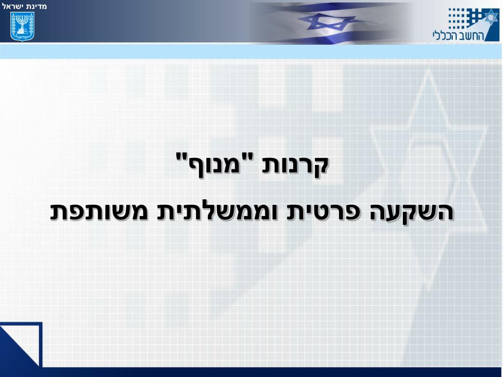 מבנה משפטי • הקרן מאוגדת כשותפות מוגבלת: • מנהל הקרן – השותף הכללי. • הממשלה והמשקיעים המוסדיים – שותפים מוגבלים. תנאי השותפות מוסדרים באמצעות הסכם שותפות המהווה חלק ממסמכי המכרז. • הטבות של הממשלה למשקיעים המוגבלים בקרן.