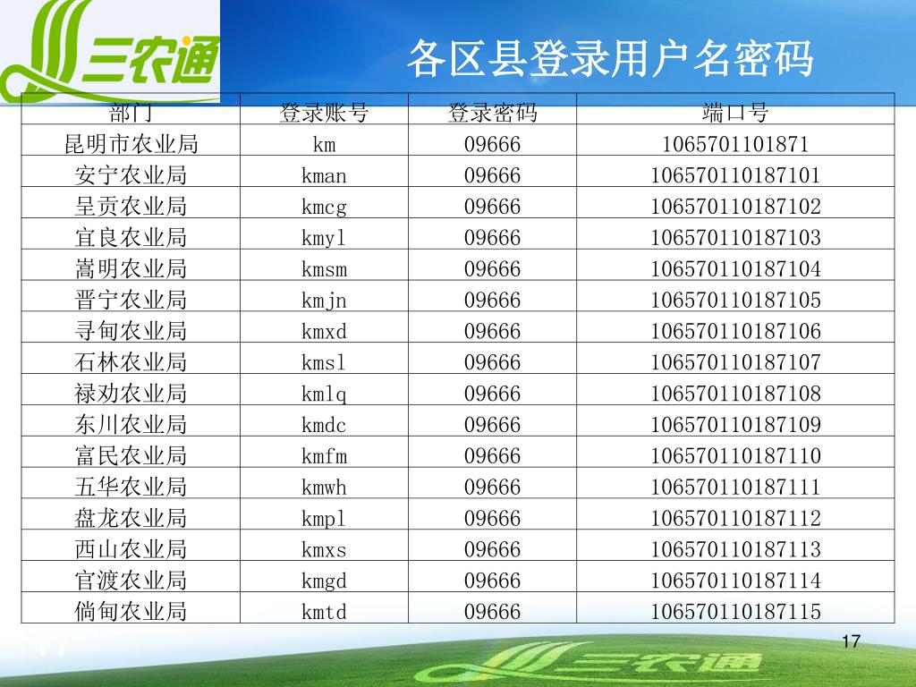 三农通业务介绍 “三农通”业务是云南移动公司和新华社云南分社合作开发的、对农民提供信息化扶贫的业务。主要目标是整合云南移动覆盖广大农村的移动网络、数据网络和互联网等资源,通过IVR电话语音服务、手机短信、手机彩信、WEB网站等多种方式,将政府农业部门、农业科研机构、农业院校、涉农企业、信息服务站提供的农业信息及时传递到农民的手中,彻底解决农村信息来源和信息传输的“最后一公里”问题,促进农业信息有效传播。 “三农通”业务全省统一短信服务号码1065701101+3位区号+2位区县编号。