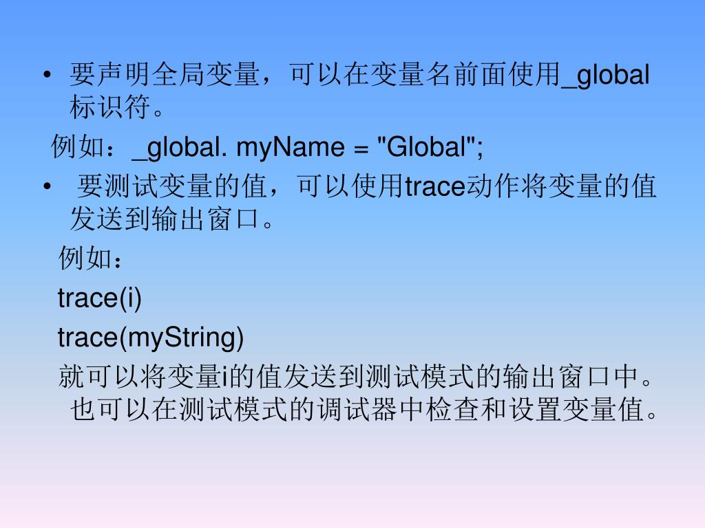 要声明全局变量,可以在变量名前面使用_global标识符。要声明全局变量,可以在变量名前面使用_global标识符。 例如:_global. myName = "Global"; • 要测试变量的值,可以使用trace动作将变量的值发送到输出窗口。 例如: trace(i) trace(myString) 就可以将变量i的值发送到测试模式的输出窗口中。也可以在测试模式的调试器中检查和设置变量值。
