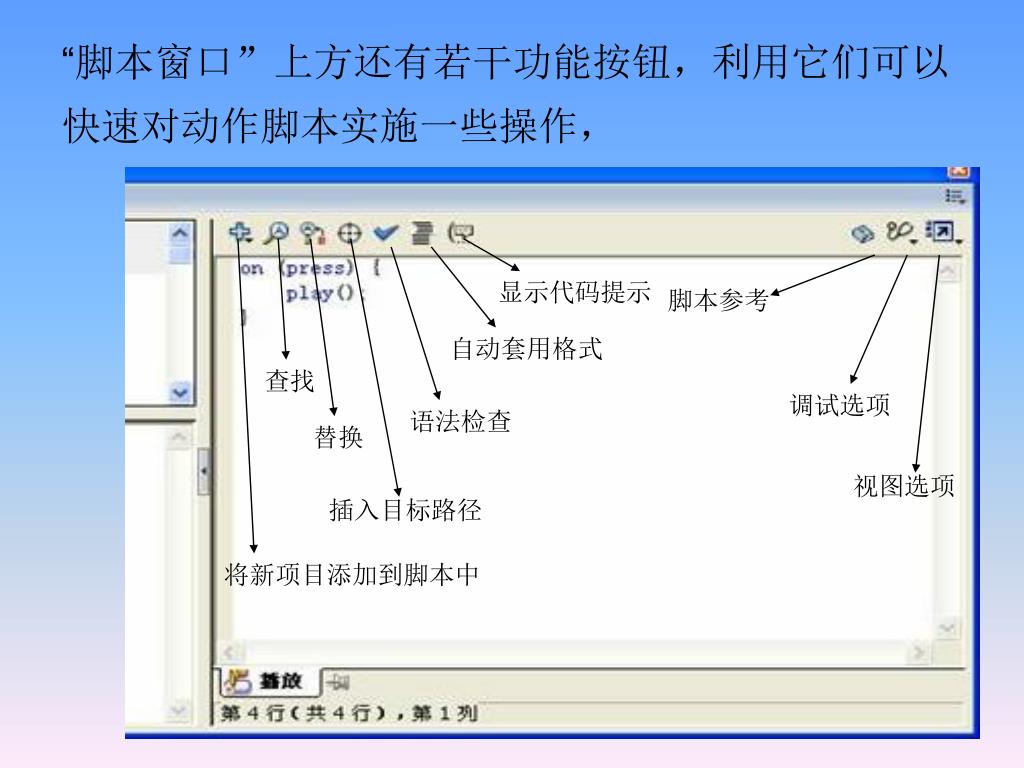 “脚本窗口”上方还有若干功能按钮,利用它们可以快速对动作脚本实施一些操作,“脚本窗口”上方还有若干功能按钮,利用它们可以快速对动作脚本实施一些操作, 显示代码提示 脚本参考 自动套用格式 查找 调试选项 语法检查 替换 视图选项 插入目标路径 将新项目添加到脚本中