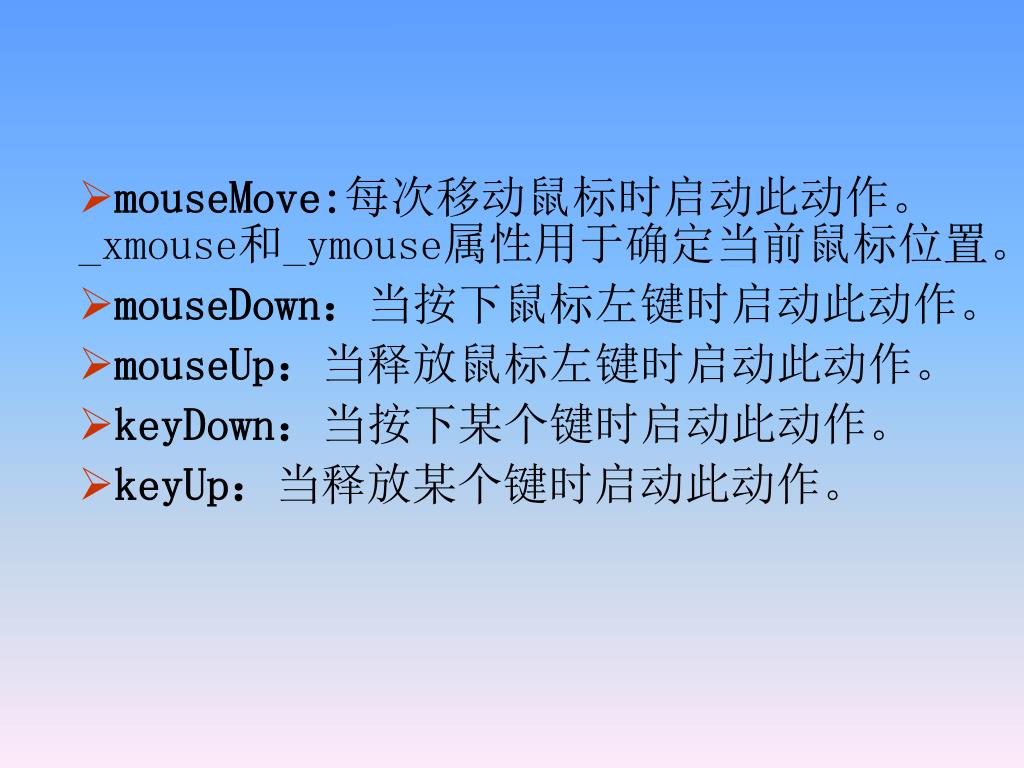 mouseMove:每次移动鼠标时启动此动作。_xmouse和_ymouse属性用于确定当前鼠标位置。mouseMove:每次移动鼠标时启动此动作。_xmouse和_ymouse属性用于确定当前鼠标位置。 • mouseDown:当按下鼠标左键时启动此动作。 • mouseUp:当释放鼠标左键时启动此动作。 • keyDown:当按下某个键时启动此动作。 • keyUp:当释放某个键时启动此动作。