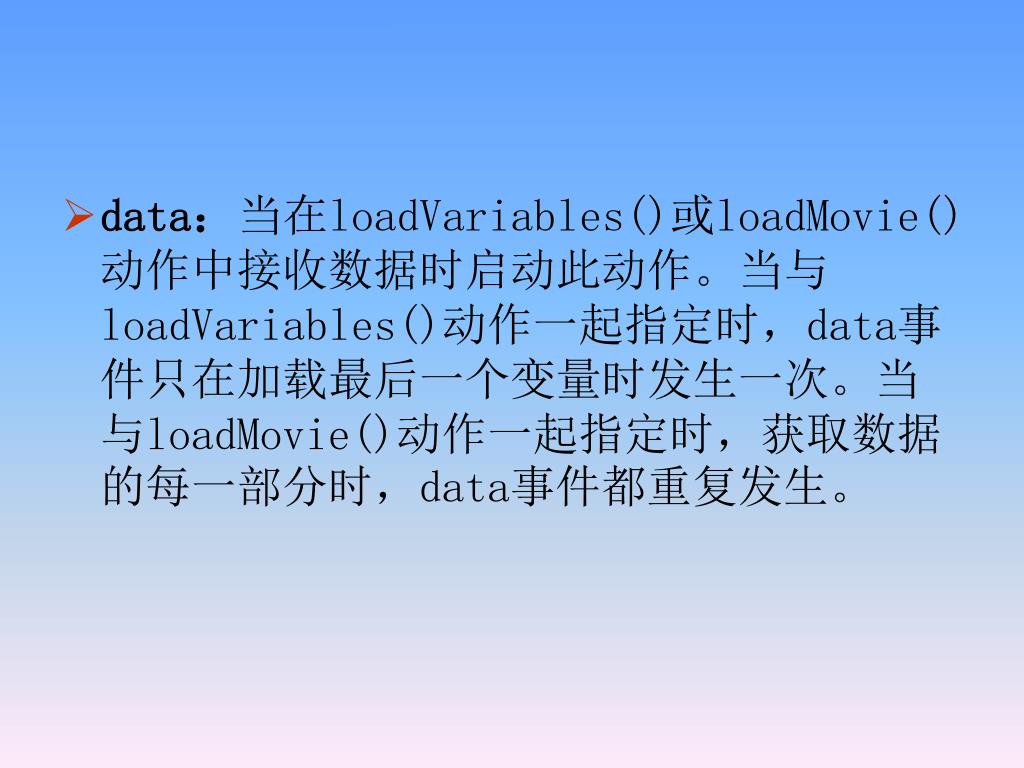 data:当在loadVariables()或loadMovie()动作中接收数据时启动此动作。当与loadVariables()动作一起指定时,data事件只在加载最后一个变量时发生一次。当与loadMovie()动作一起指定时,获取数据的每一部分时,data事件都重复发生。data:当在loadVariables()或loadMovie()动作中接收数据时启动此动作。当与loadVariables()动作一起指定时,data事件只在加载最后一个变量时发生一次。当与loadMovie()动作一起指定时,获取数据的每一部分时,data事件都重复发生。
