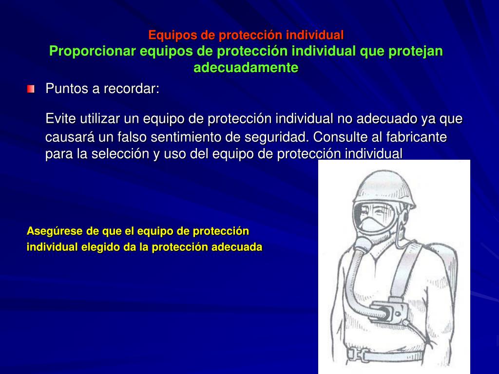 Equipos de protección individualAsegurar el uso habitual del equipo de protección individual mediante las instrucciones y la formación adecuadas, y periodos de prueba para la adaptación • Puntos a recordar: La utilización regular en el trabajo de los equipos de protección individual ahorra dinero y reduce el sufrimiento humano Todos los trabajadores que necesiten utilizar equipos de protección deberían ser entrenados regularmente en su uso, cuidado y mantenimiento.