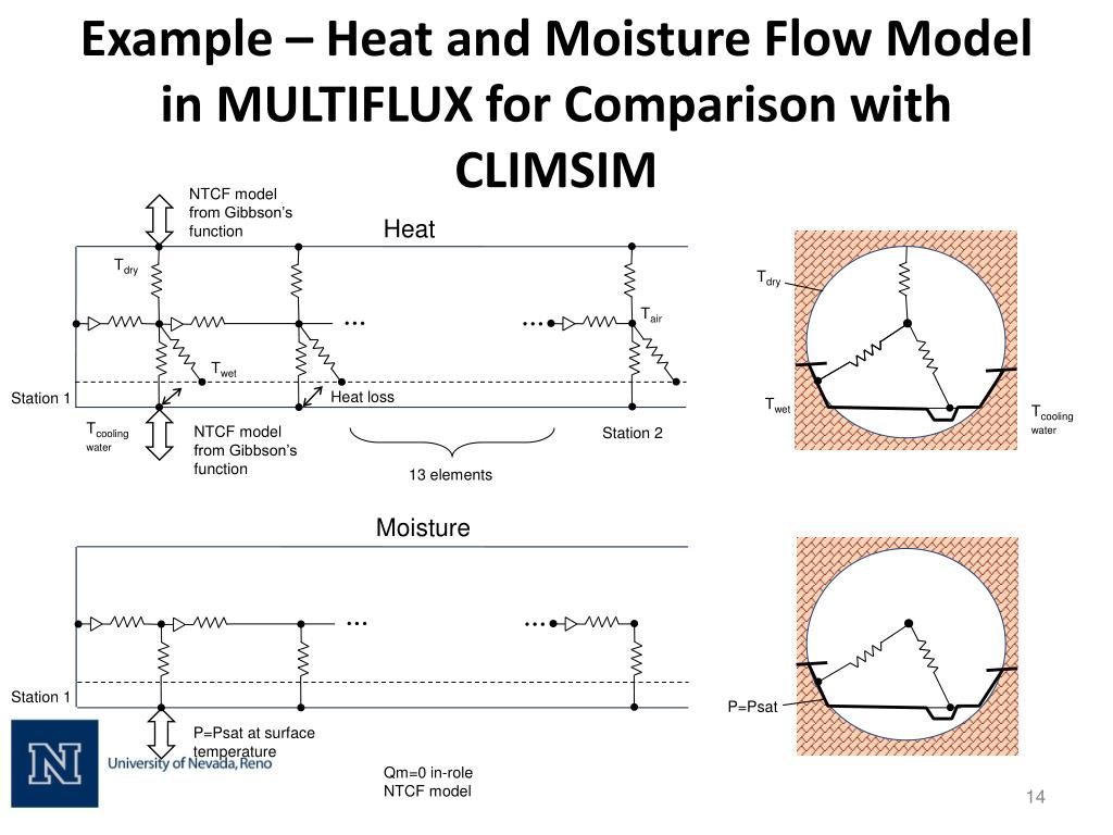 Example – Heat and Moisture Flow Model in MULTIFLUX for Comparison with CLIMSIM NTCF model from Gibbson’s function Heat Tdry Tdry Tair Twet Heat loss Station 1 Twet Tcooling water Tcooling water NTCF model from Gibbson’s function Station 2 13 elements Moisture Station 1 P=Psat P=Psat at surface temperature Qm=0 in-role NTCF model