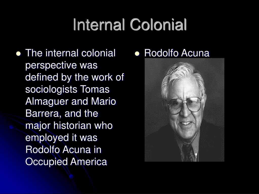 The internal colonial perspective was defined by the work of sociologists Tomas Almaguer and Mario Barrera, and the major historian who employed it was Rodolfo Acuna in Occupied America Rodolfo Acuna Internal Colonial
