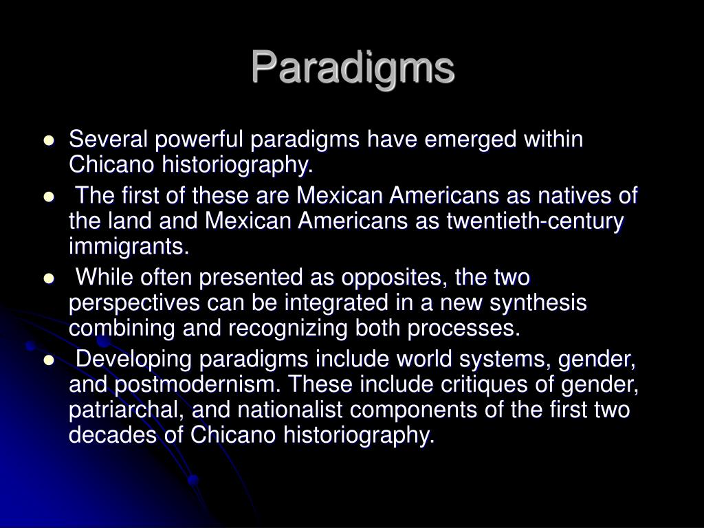 Paradigms • Several powerful paradigms have emerged within Chicano historiography. • The first of these are Mexican Americans as natives of the land and Mexican Americans as twentieth-century immigrants. • While often presented as opposites, the two perspectives can be integrated in a new synthesis combining and recognizing both processes. • Developing paradigms include world systems, gender, and postmodernism. These include critiques of gender, patriarchal, and nationalist components of the first two decades of Chicano historiography.