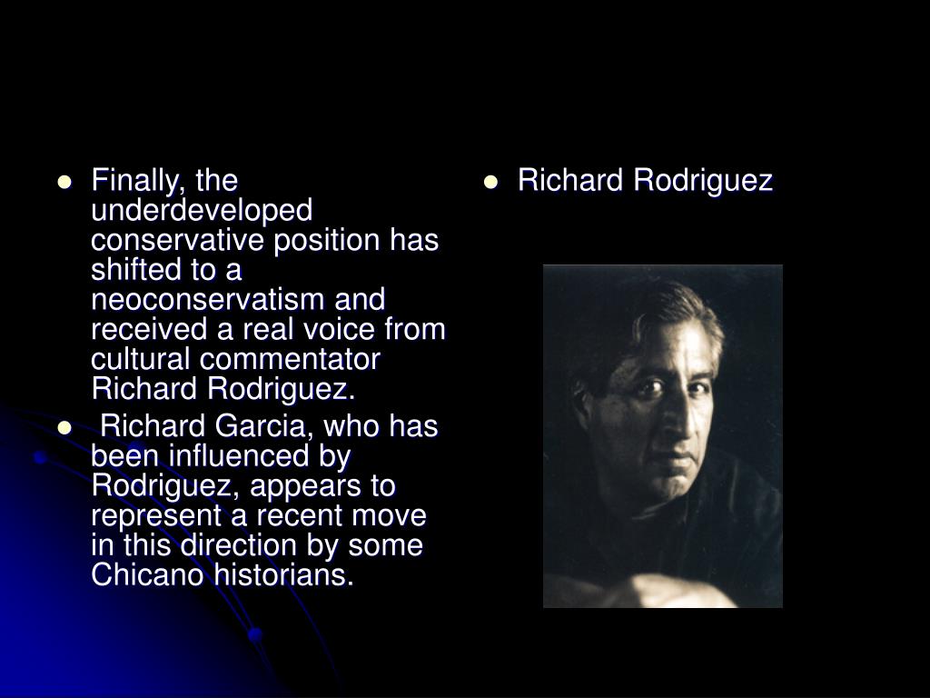Finally, the underdeveloped conservative position has shifted to a neoconservatism and received a real voice from cultural commentator Richard Rodriguez. Richard Garcia, who has been influenced by Rodriguez, appears to represent a recent move in this direction by some Chicano historians. Richard Rodriguez