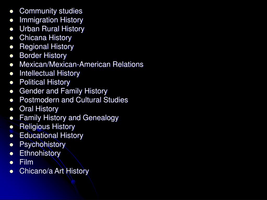 Community studies • Immigration History • Urban Rural History • Chicana History • Regional History • Border History • Mexican/Mexican-American Relations • Intellectual History • Political History • Gender and Family History • Postmodern and Cultural Studies • Oral History • Family History and Genealogy • Religious History • Educational History • Psychohistory • Ethnohistory • Film • Chicano/a Art History