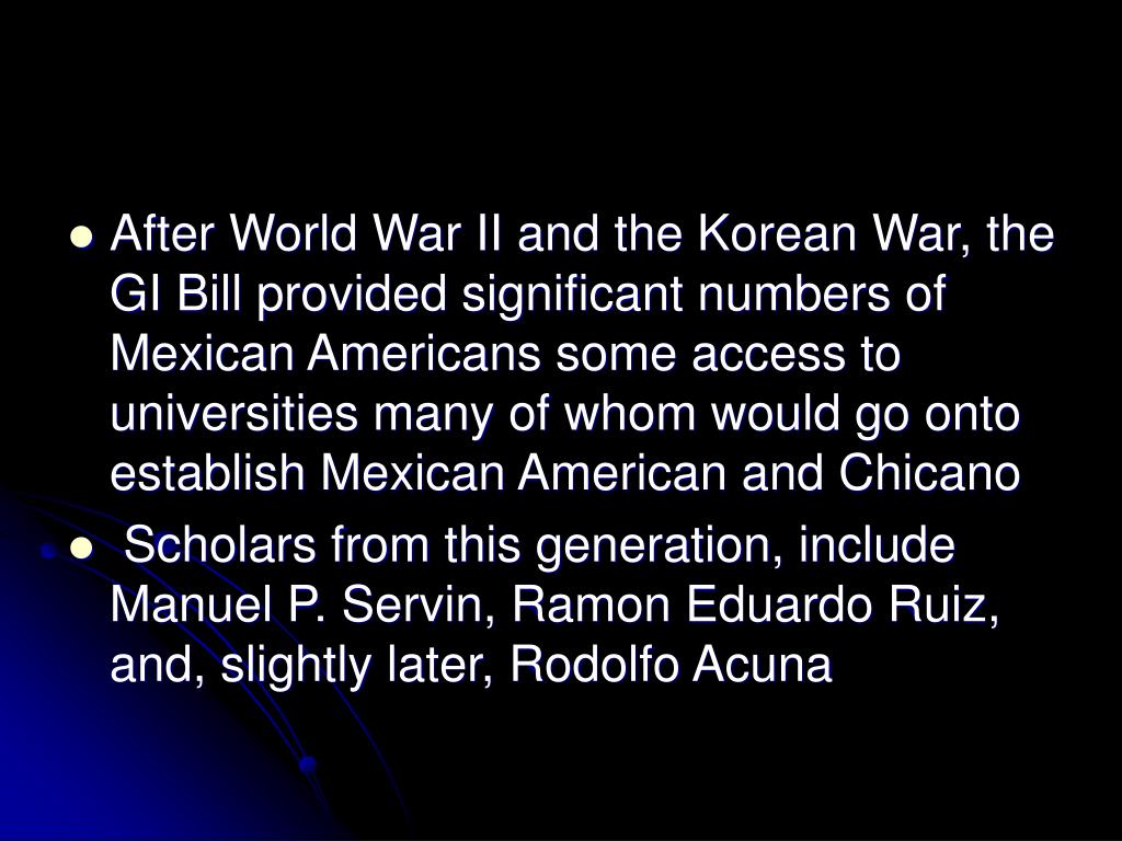 After World War II and the Korean War, the GI Bill provided significant numbers of Mexican Americans some access to universities many of whom would go onto establish Mexican American and Chicano • Scholars from this generation, include Manuel P. Servin, Ramon Eduardo Ruiz, and, slightly later, Rodolfo Acuna