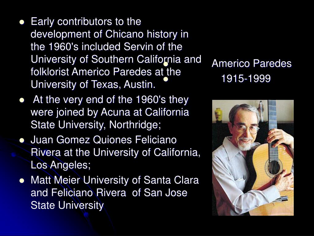 Early contributors to the development of Chicano history in the 1960's included Servin of the University of Southern California and folklorist Americo Paredes at the University of Texas, Austin. At the very end of the 1960's they were joined by Acuna at California State University, Northridge; Juan Gomez Quiones Feliciano Rivera at the University of California, Los Angeles; Matt Meier University of Santa Clara and Feliciano Rivera of San Jose State University Americo Paredes 1915-1999