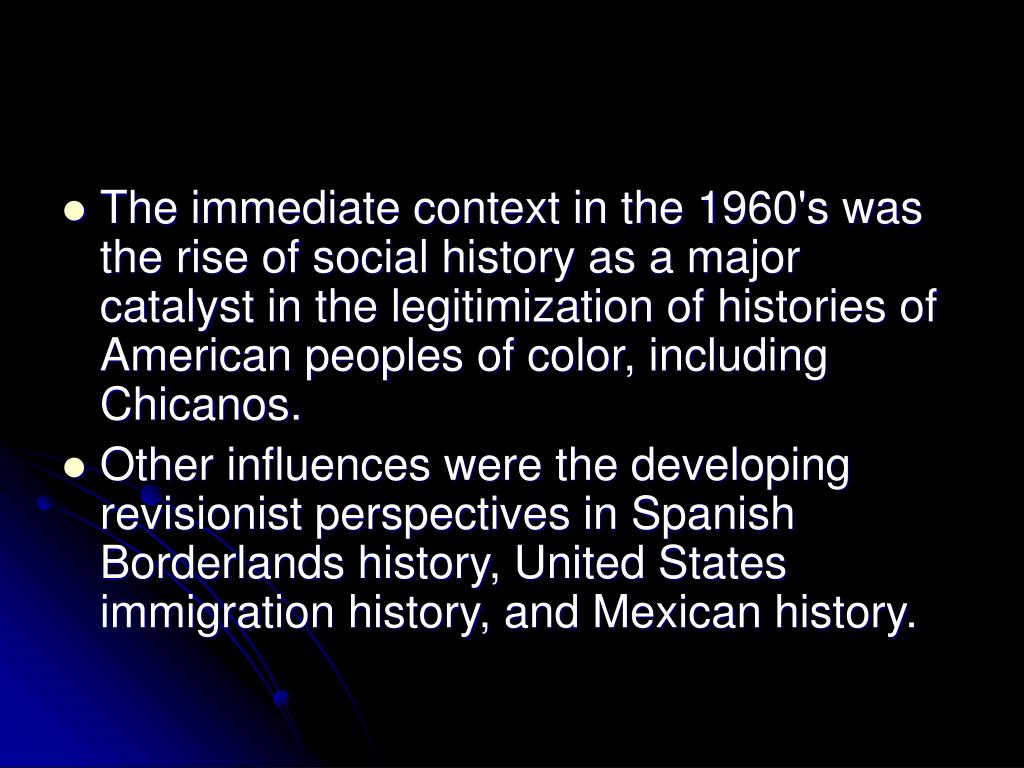 The immediate context in the 1960's was the rise of social history as a major catalyst in the legitimization of histories of American peoples of color, including Chicanos. • Other influences were the developing revisionist perspectives in Spanish Borderlands history, United States immigration history, and Mexican history.