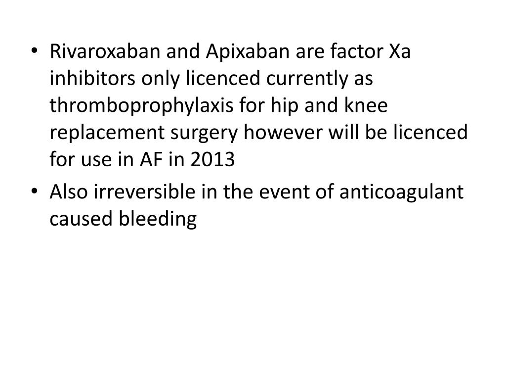 Rivaroxaban and Apixaban are factor Xa inhibitors only licenced currently as thromboprophylaxis for hip and knee replacement surgery however will be licenced for use in AF in 2013 • Also irreversible in the event of anticoagulant caused bleeding