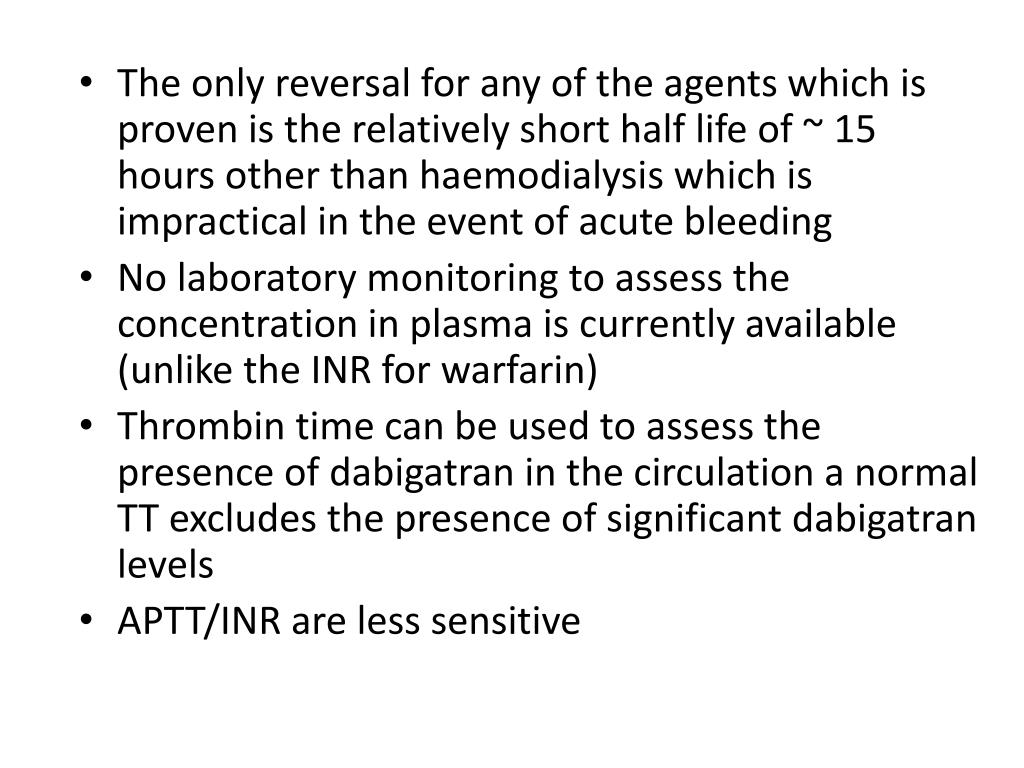 The only reversal for any of the agents which is proven is the relatively short half life of ~ 15 hours other than haemodialysis which is impractical in the event of acute bleeding • No laboratory monitoring to assess the concentration in plasma is currently available (unlike the INR for warfarin) • Thrombin time can be used to assess the presence of dabigatranin the circulation a normal TT excludes the presence of significant dabigatran levels • APTT/INR are less sensitive