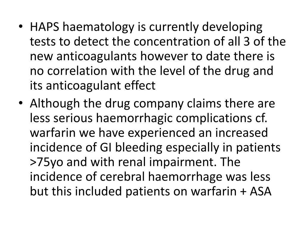 HAPS haematology is currently developing tests to detect the concentration of all 3 of the new anticoagulants however to date there is no correlation with the level of the drug and its anticoagulant effect • Although the drug company claims there are less serious haemorrhagic complications cf. warfarin we have experienced an increased incidence of GI bleeding especially in patients >75yo and with renal impairment. The incidence of cerebral haemorrhage was less but this included patients on warfarin + ASA