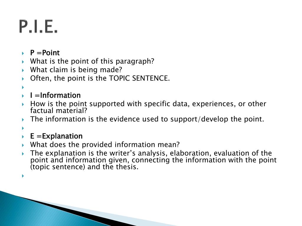 P.I.E. • P =Point • What is the point of this paragraph? • What claim is being made? • Often, the point is the TOPIC SENTENCE. • I =Information • How is the point supported with specific data, experiences, or other factual material? • The information is the evidence used to support/develop the point. • E =Explanation • What does the provided information mean? • The explanation is the writer’s analysis, elaboration, evaluation of the point and information given, connecting the information with the point (topic sentence) and the thesis.