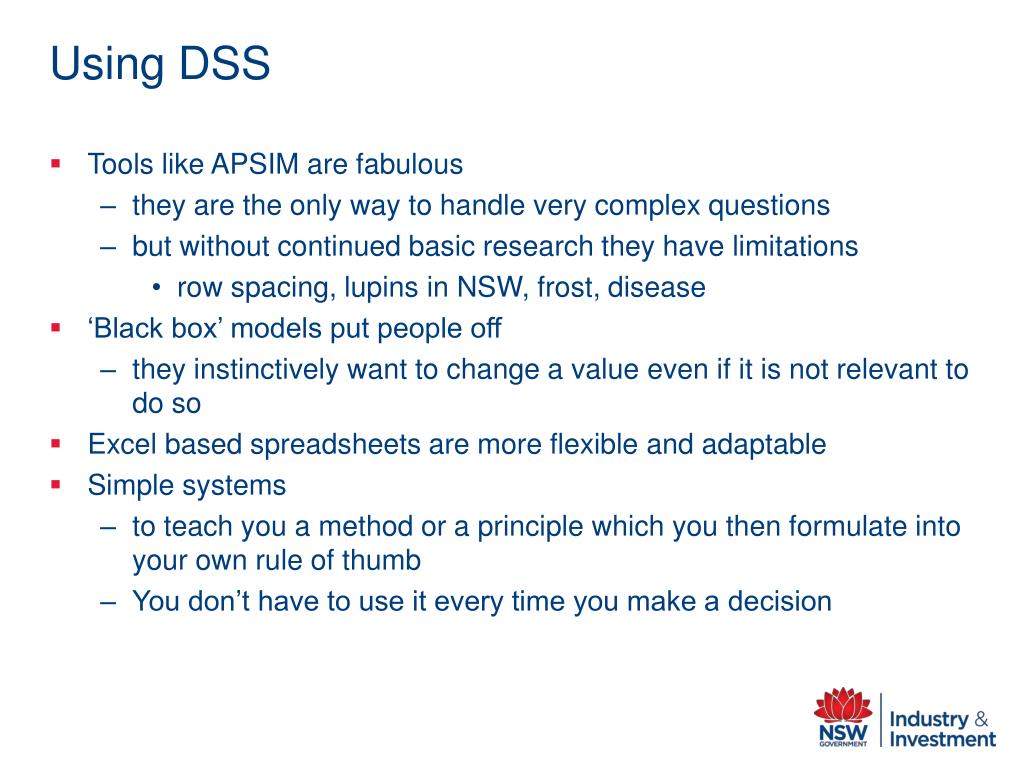 Using DSS • Tools like APSIM are fabulous • they are the only way to handle very complex questions • but without continued basic research they have limitations • row spacing, lupins in NSW, frost, disease • ‘Black box’ models put people off • they instinctively want to change a value even if it is not relevant to do so • Excel based spreadsheets are more flexible and adaptable • Simple systems • to teach you a method or a principle which you then formulate into your own rule of thumb • You don’t have to use it every time you make a decision